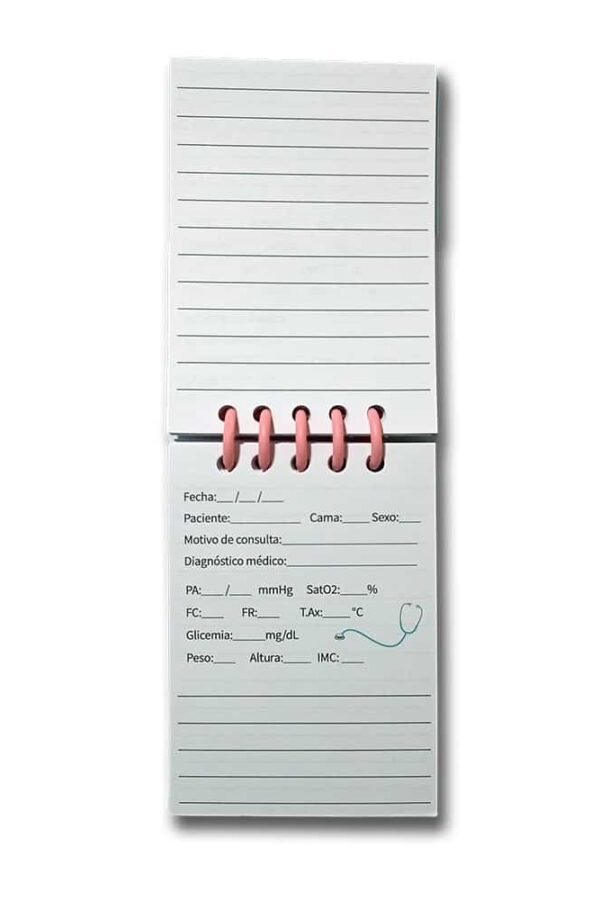 Contiene hojas intercaladas: una para tus apuntes y otra especialmente diseñada para registrar valoraciones de pacientes y signos vitales 🩺