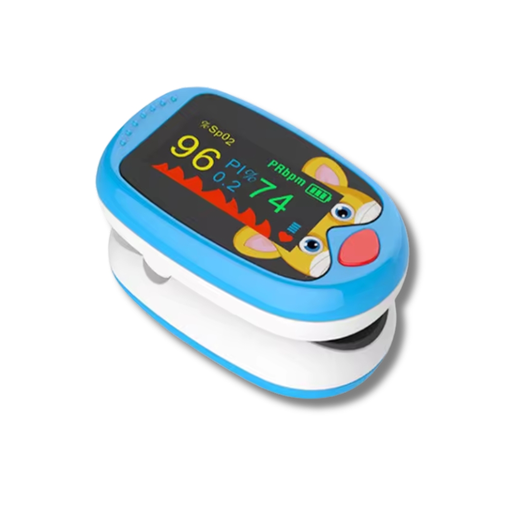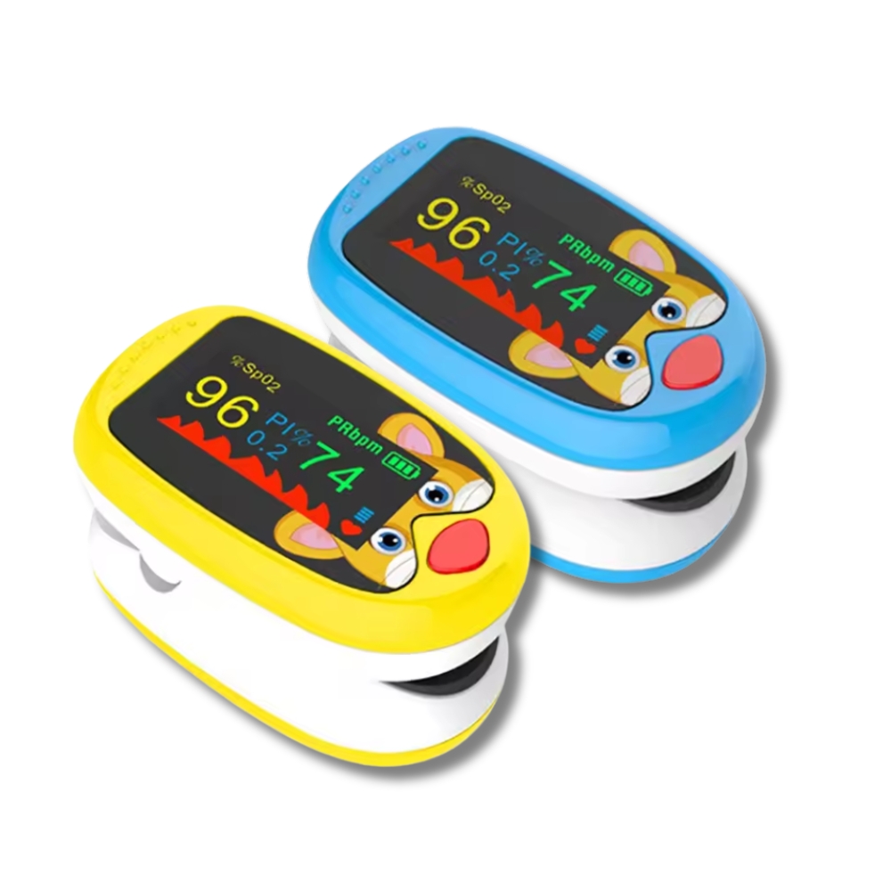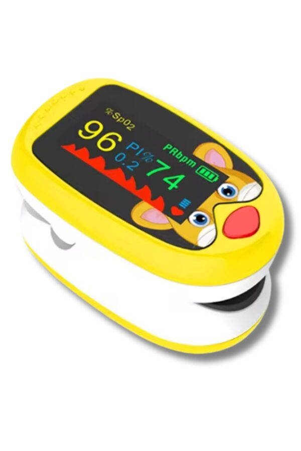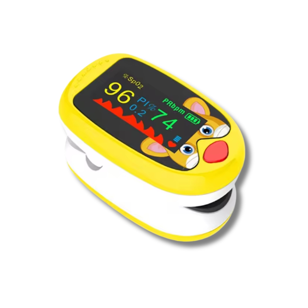 Oxímetro/Saturómetro diseñado especialmente para niños de 6 meses a 12 años, con pantalla LED clara y divertida que facilita la lectura de la saturación de oxígeno (SpO₂) y la frecuencia cardíaca. Su diseño con dibujos infantiles hace que la medición sea más amigable para los pequeños.