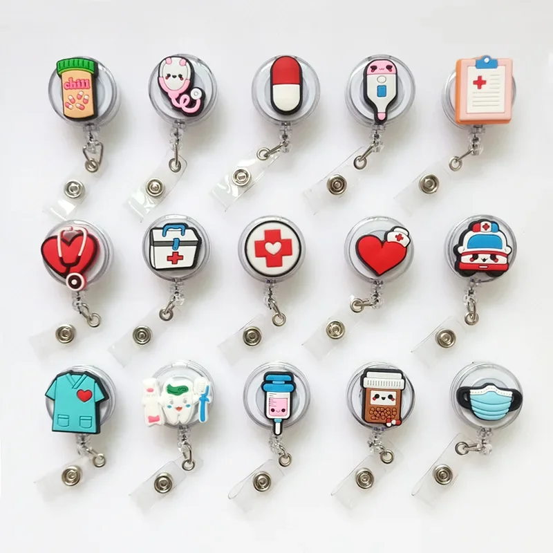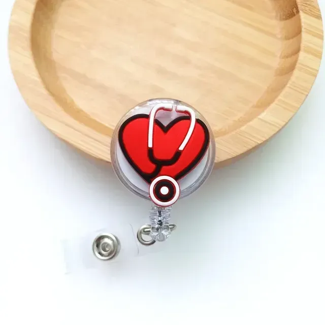| Prendedor retractil enfermería | Ambulancia, Bloc notas, Botiquín, Corazon con esteto, Corazón con gorro, Curita, Enfermera, Esteto negro, Esteto Rosado, Frasco Chill, Frasco marron, Jeringa, Muela, Pildora, Termometro, Uniforme con corazon, Uniforme femenino |